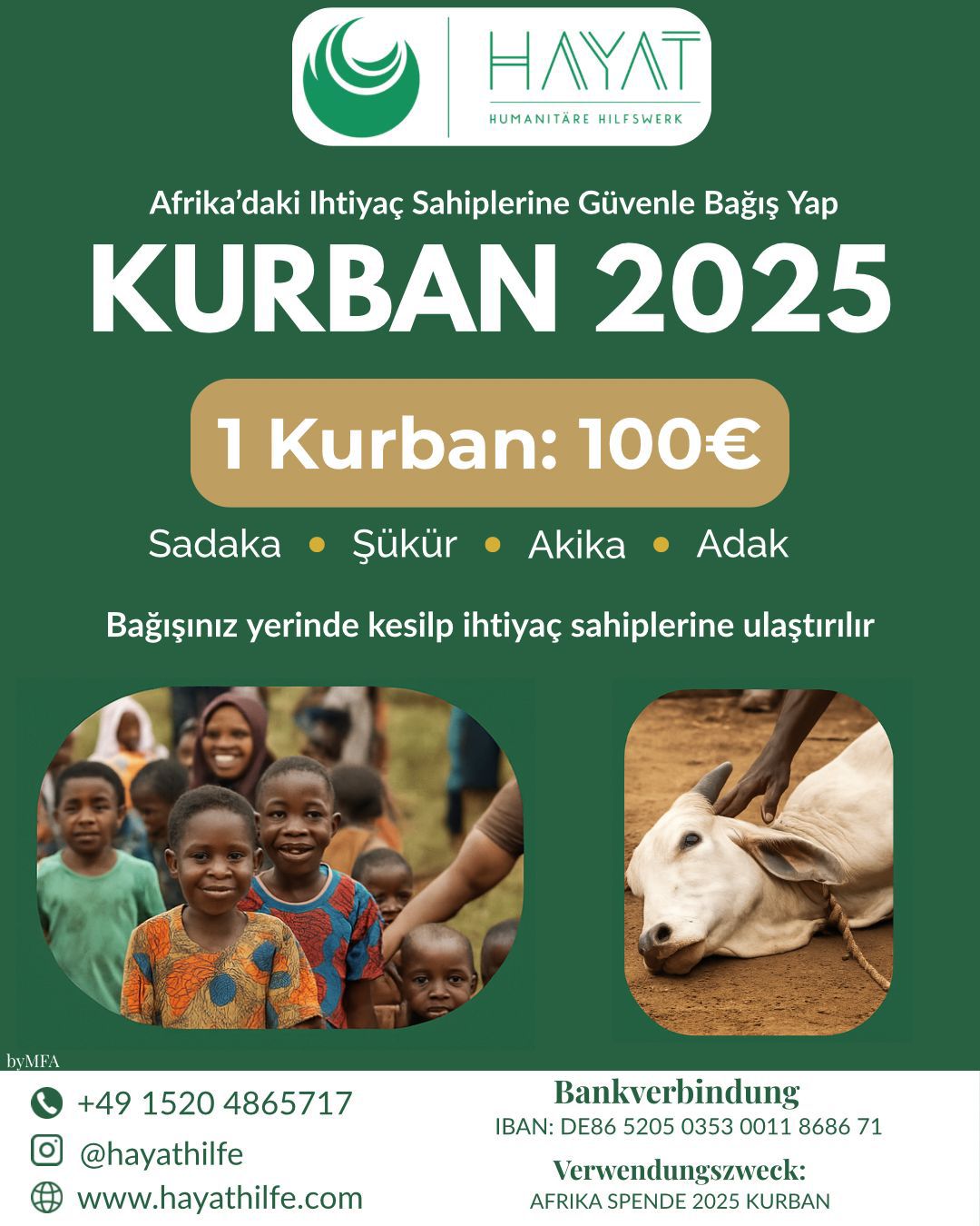 HAYAT Derneği tarafından “Kurbanını Sen de Paylaş” adıyla yürütülen adak, akika ve vacip kurban projeleri, yıl boyunca Afrika’nın çeşitli köylerinde başarıyla tamamlandı. Bağışçılarımız adına kesilen kurbanlıklar, İslami usullere uygun şekilde özenle seçildi; kesim işlemleri hijyen kurallarına dikkat edilerek gerçekleştirildi. Ardından, etler paketlenerek dağıtım noktalarına taşındı ve ihtiyaç sahibi ailelere eksiksiz bir şekilde ulaştırıldı. Her kurban, yalnızca bir ibadet değil; bir sofraya umut, bir kalbe sevinç oldu.